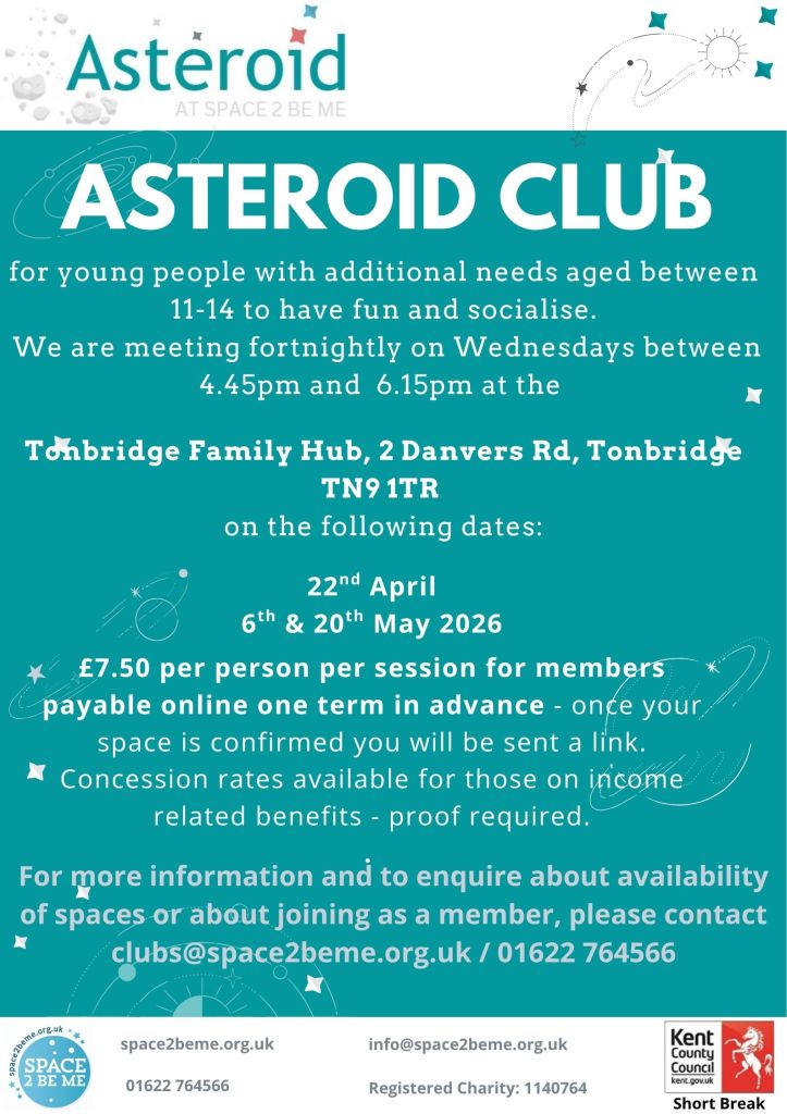 Asteroid club is held at 4.45- 6.15pm on alternate Wednesdays at the The Tonbridge Family Hub, Danvers Rd, Tonbridge TN9 1TG.