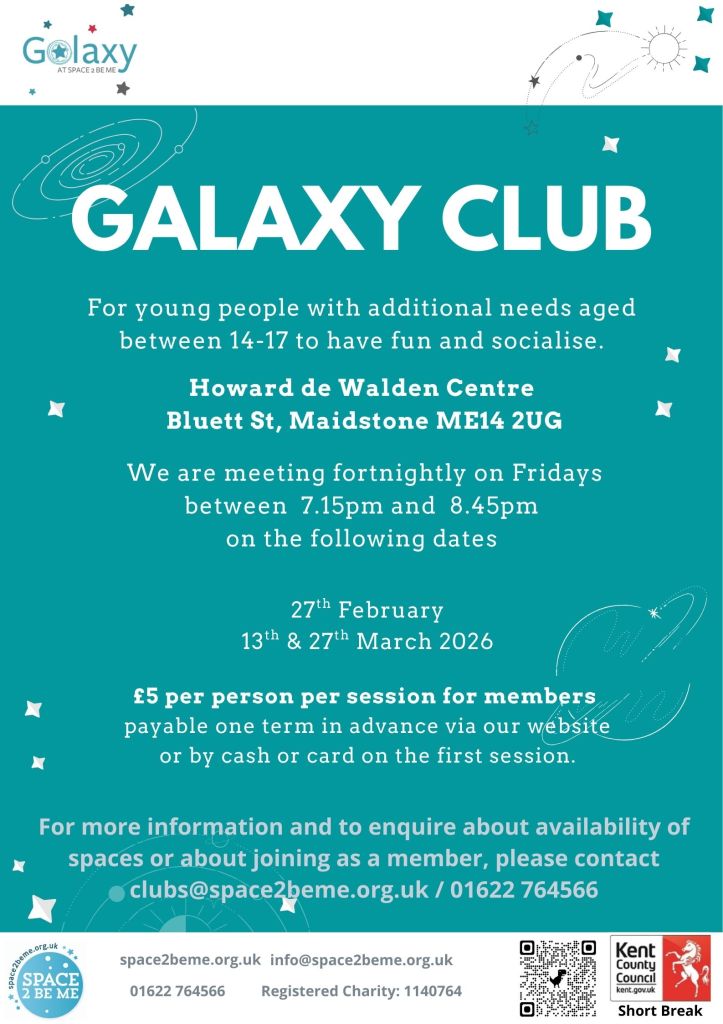 If you are interested in finding out more or to enquire about availability of spaces, please email clubs@space2beme.org.uk or call 01622 764566.