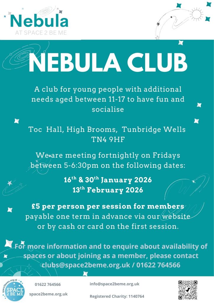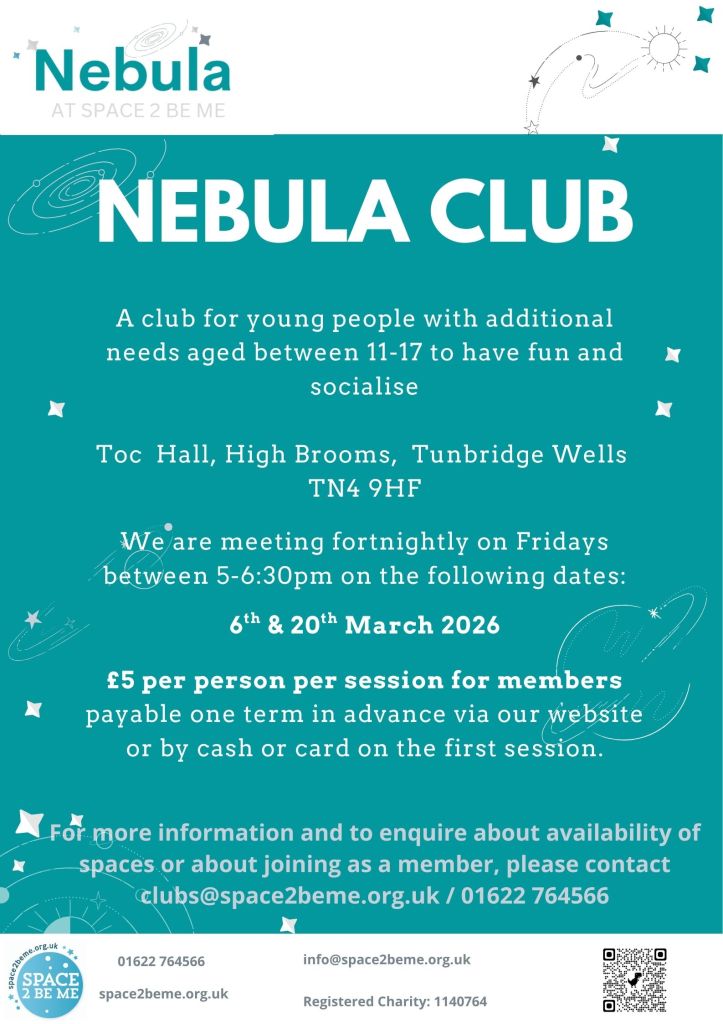 For more information and to enquire about availability of spaces or about joining as a member, please contact clubs@space2beme.org.uk / 01622 764566