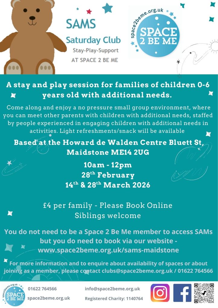 You do not need to be a Space 2 Be Me member to access SAMs but you do need to book online. For more information and to enquire about availability of spaces or about joining as a member, please contact clubs@space2beme.org.uk / 01622 764566.