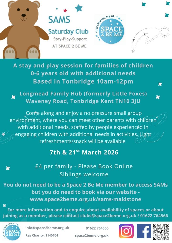 You do not need to be a Space 2 Be Me member to access SAMs but you do need to book online. For more information and to enquire about availability of spaces or about joining as a member, please contact clubs@space2beme.org.uk / 01622 764566.