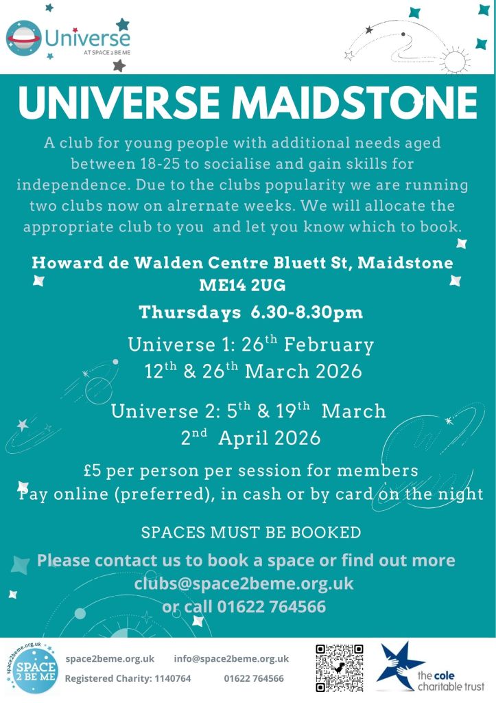 For more information and to enquire about availability of spaces, please contact clubs@space2beme.org.uk / 01622 764566.