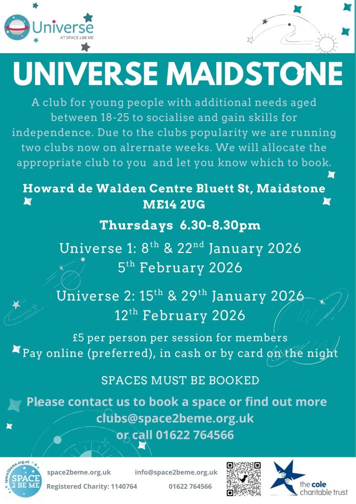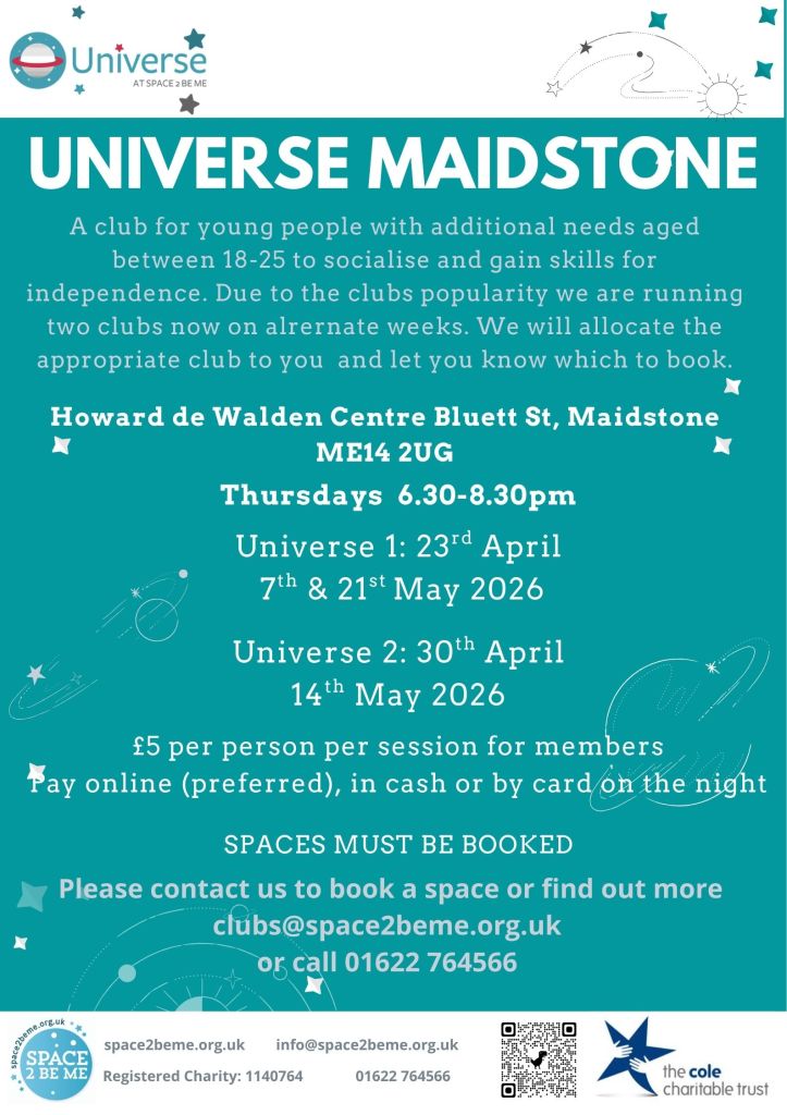 For more information and to enquire about availability of spaces, please contact clubs@space2beme.org.uk / 01622 764566.